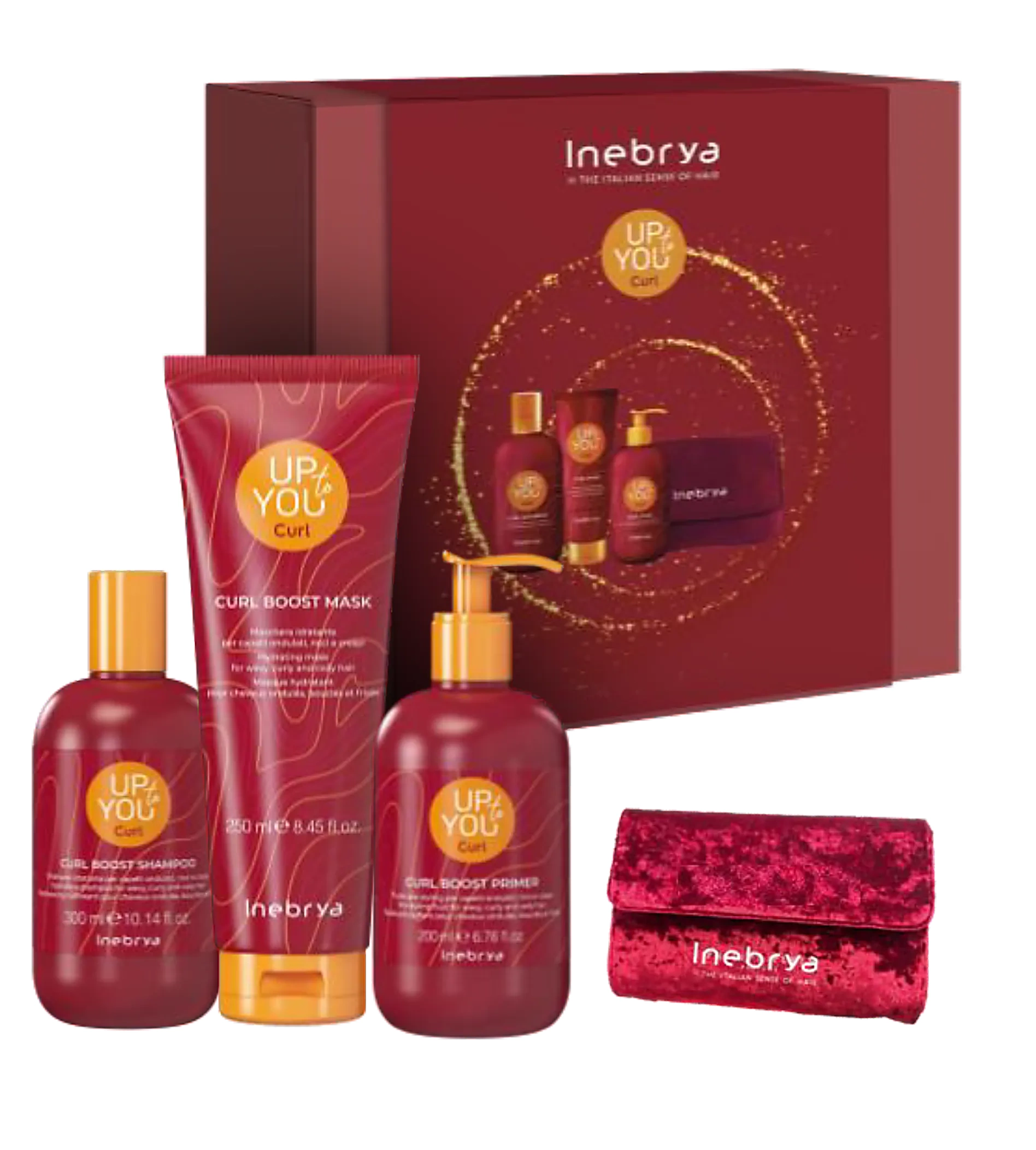 Ajándékcsomag hullámos és göndör hajra, amely segít támogatni a hullámok természetes formáját, és hidratálást, táplálást és rugalmasságot biztosít számukra. Az Inebrya Up To You Curl Boost vegán sorozat a kreppesedés nélküli definícióra összpontosít – a haj használat után selymes, rugalmas és rendezett hatású, anélkül, hogy elnehezülne. A készlet mindennapi ápolásra és a göndör haj rutinjának praktikus kezdésére is alkalmas, ráadásul egy stílusos bónuszként kozmetikai táskával.