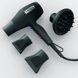KIEPE BARBER THOOR - kiváló minőségű és rendkívül hatékony hajszárító. 1800-2200 W teljesítményű motorral. A THOOR képes állandó és erős légáramlást biztosítani, ideális a haj gyors szárításához. A hajszárító modern és elegáns kialakítása, amelyet jellegzetes tiszta és elegáns vonalak jellemeznek, soft-touch felülettel párosul, ami a magas minőség és a részletekre való odafigyelés érzetét kelti. Tökéletes professzionális szalonhasználatra. A két cserélhető fúvóka jelenléte, az egyik széles, a másik keskeny, lehetővé teszi, hogy a légáramlást oda összpontosítsa, ahol a legnagyobb szükség van rá. Ezenkívül a különböző sebesség- és hőmérséklet-beállítások lehetővé teszik a különböző szárítási igényekhez való alkalmazkodást.