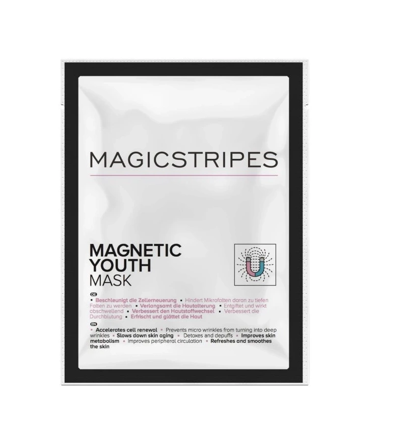 Magicstripes Magnetic Youth Mask je jednorázová omlazující pleťová maska s magnetickými částečkami, která podporuje regeneraci pokožky a působí proti známkám stárnutí. Magnetická technologie stimuluje mikrocirkulaci, zlepšuje okysličení pleti a pomáhá odstraňovat toxiny i nečistoty. Díky obohacení o minerály, vitamíny a pečující složky zanechává pleť hladkou, svěží a viditelně mladší. Praktické balení 1 ks je ideální na vyzkoušení nebo jako rychlá omlazující kúra.