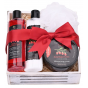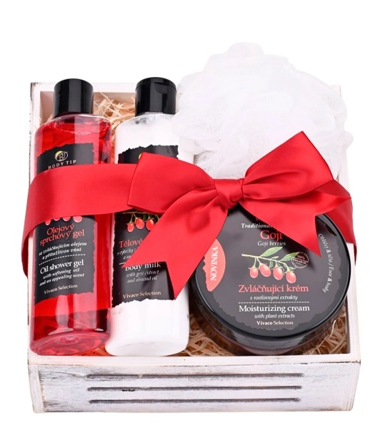 Gyönyörű ajándékcsomagolás kozmetikumokkal dekoratív ládikában, kínai farkasbogyó kivonattal és mandulaolajjal.