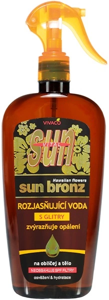 Ragyogó víz ragyogó arany csillámokkal a bőr ragyogásáért és a bronz bőr hatásának kiemeléséért. Tartalmaz TYROSIN Bronz gyorsítót a bőr barnulásának felgyorsítására. Különösen alkalmas az arc és a napfénynek, homoknak és tengeri sónak kitett területek kezelésére. Javasoljuk, hogy kombinálja napvédő krémmel.
